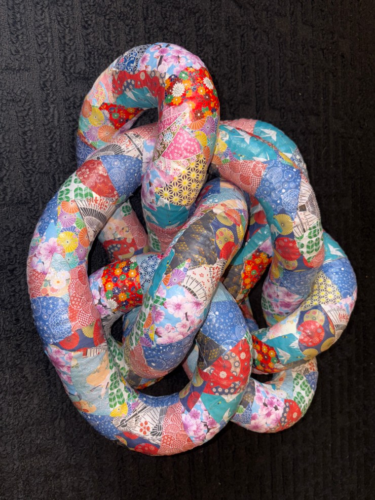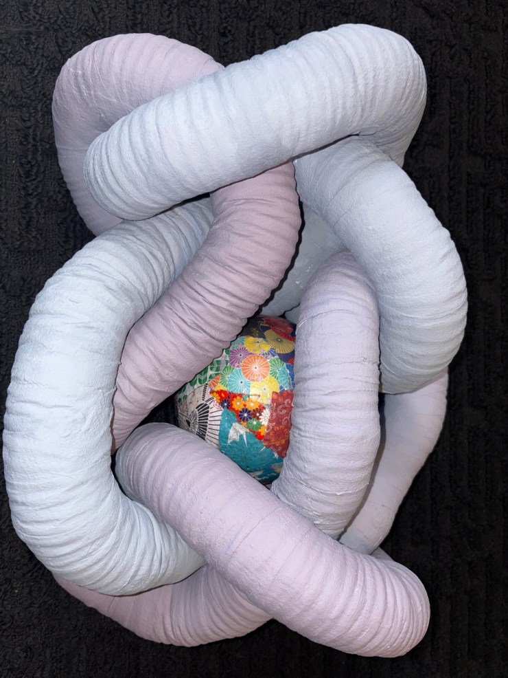Materials: Dryer vent, armature wire, plaster bandages, sheetrock screws, cardboard ring, wood, joint compound, heavy-bodied metallic acrylic texture paint.