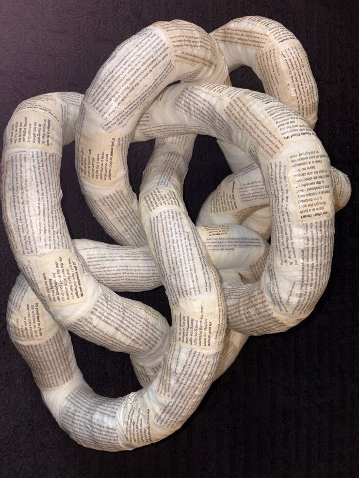 Materials: 2″ metal vent, self-adhesive bandages, acrylic paint, Mod Podge, and bandages. Selections of text from the following books: “The Self Acceptance Project”, “The Body Keeps Score”, “Rumi Day by Day”, “Rumi Dancing The Flame”, “Introducing Psychoanalysis”.
