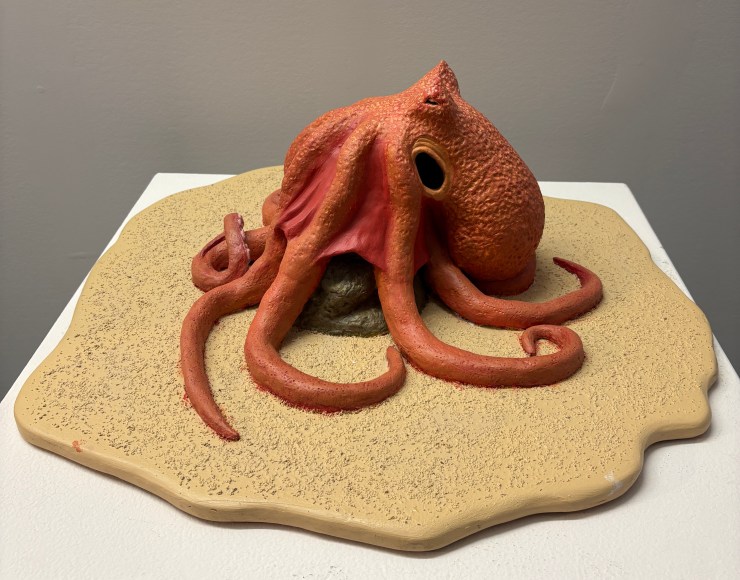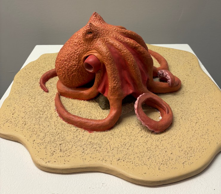 Octopus sculpture (tentacles assembled after firing). Materials: clay, epoxy, acrylic paint, plywood, sand.